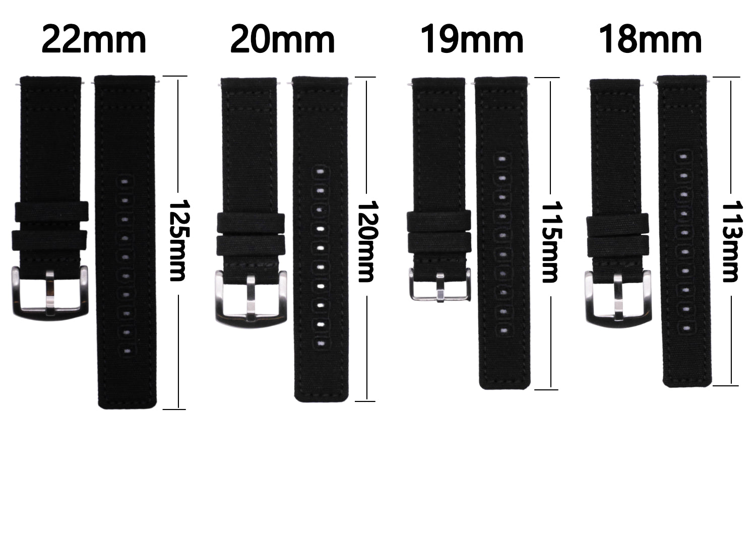 This high-quality 2-piece Canvas Sports / Field Watch Strap is available in 18mm, 19mm, 20mm, and 22mm lug width sizes. It includes quick-release spring bars for easy installation. The strap will come with a silver buckle by default, but black buckles are available upon request. If you'd prefer a black buckle, please send a message before placing your order, and we’ll make the swap.