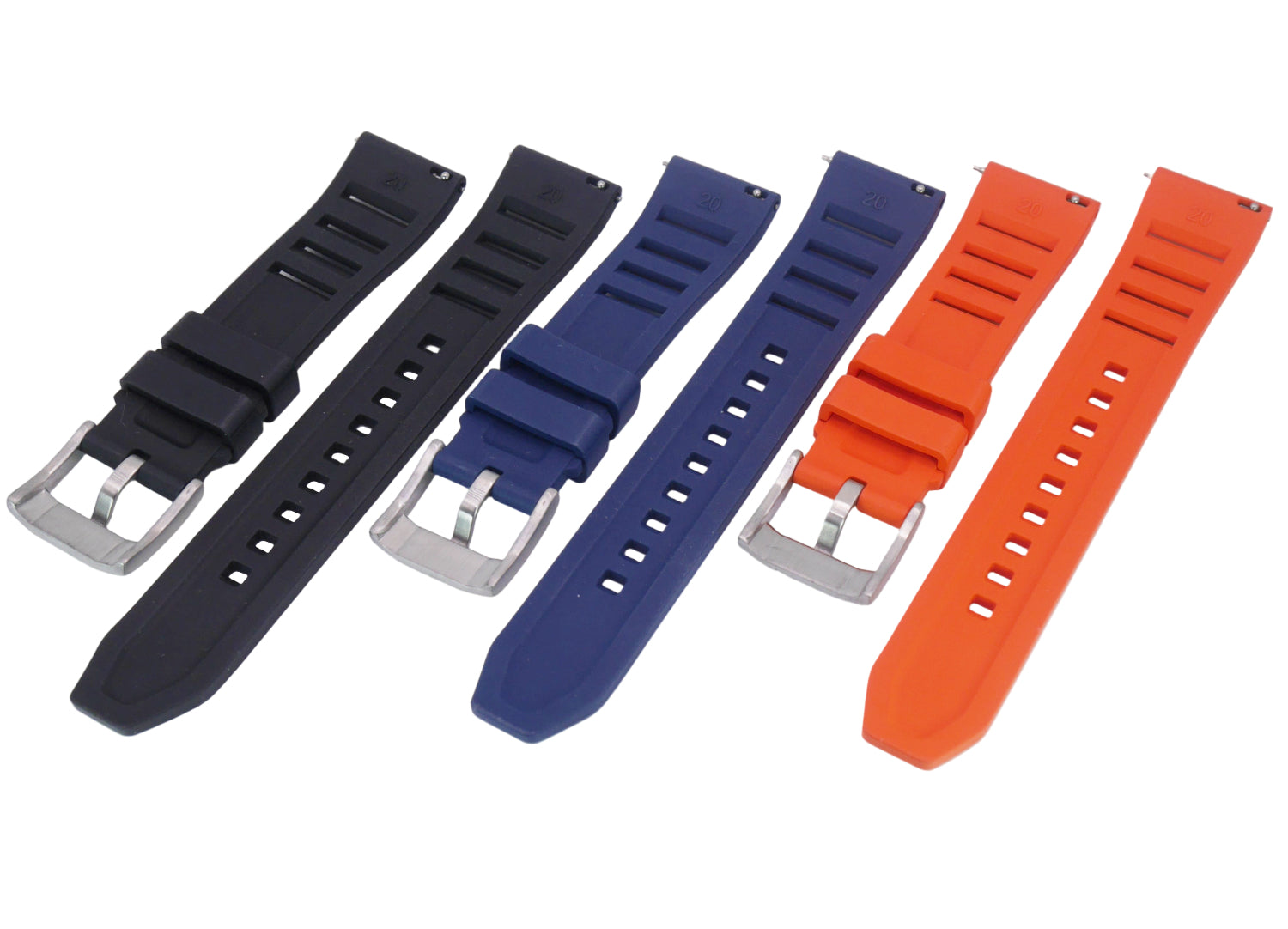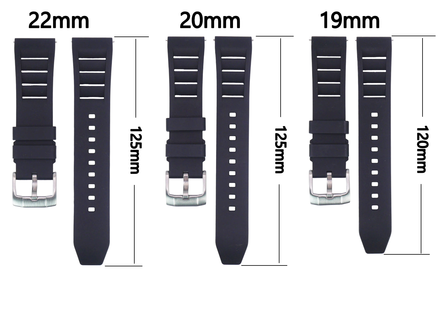 This high-quality 2-piece FKM Rubber Vented Divers Watch Strap is available in 19mm, 20mm, and 22mm lug width sizes. It includes quick-release spring bars for easy installation. The strap will come with a silver buckle by default, but black buckles are available upon request. If you'd prefer a black buckle, please send a message before placing your order, and we’ll make the swap.